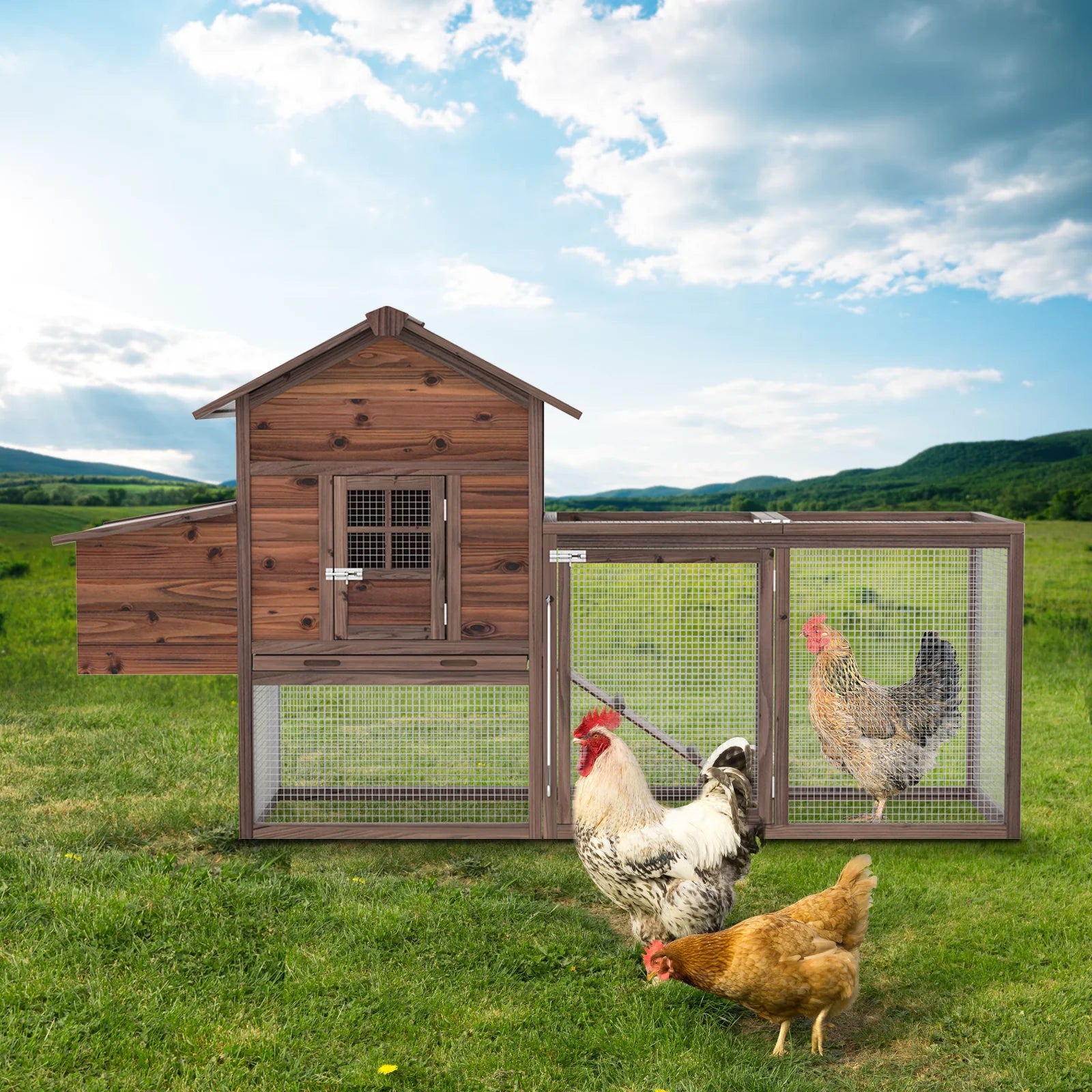 Chicken Coop Dimensions: 162"L x 27"W x 44.5"H,96 Pounds. Metal bar on