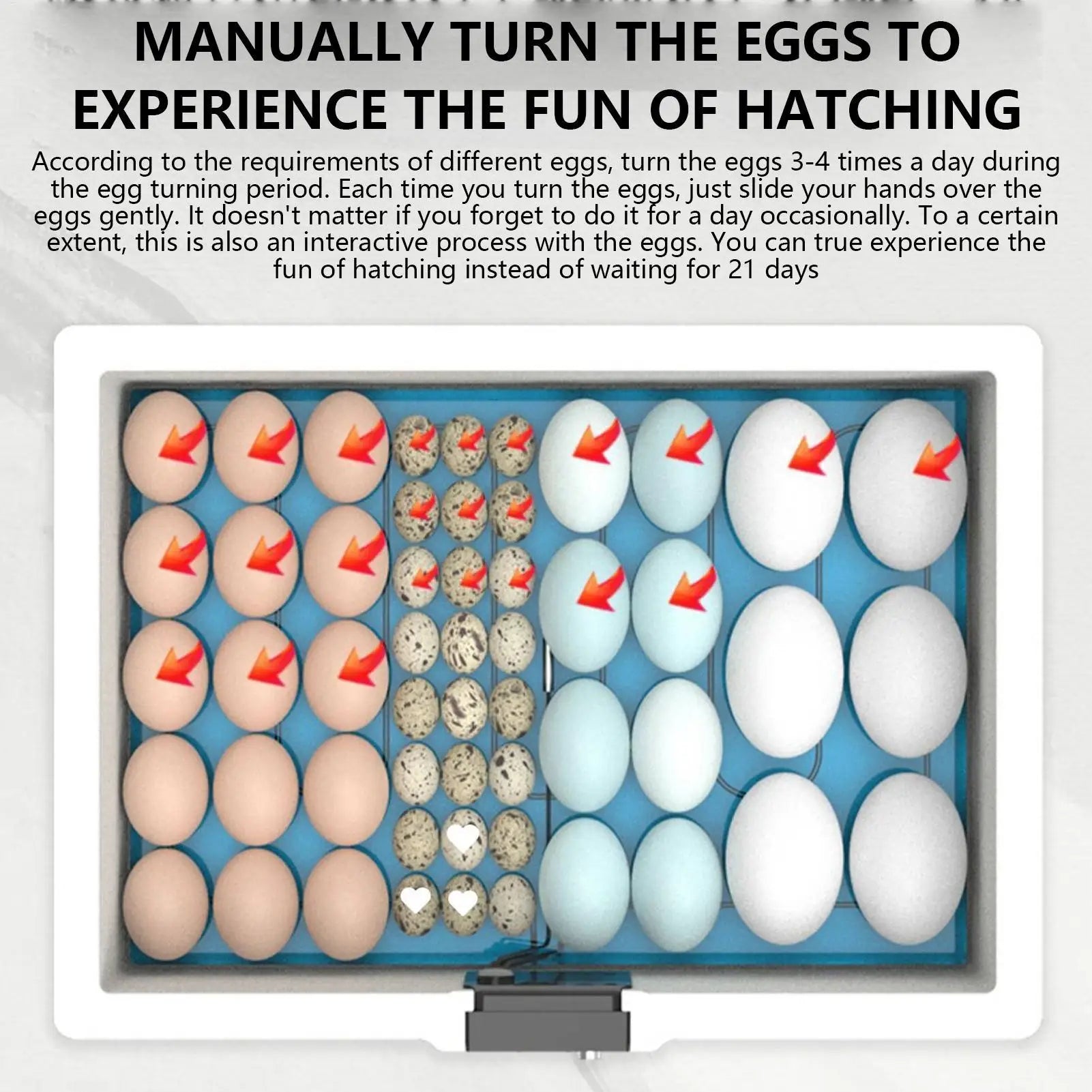 5.User-Friendly Precision: Equipped with a smart humidity sensor and visual panel for precise monitoring, while offering manual turning ease, and user-friendly design ensures optimal incubation conditions effortlessly