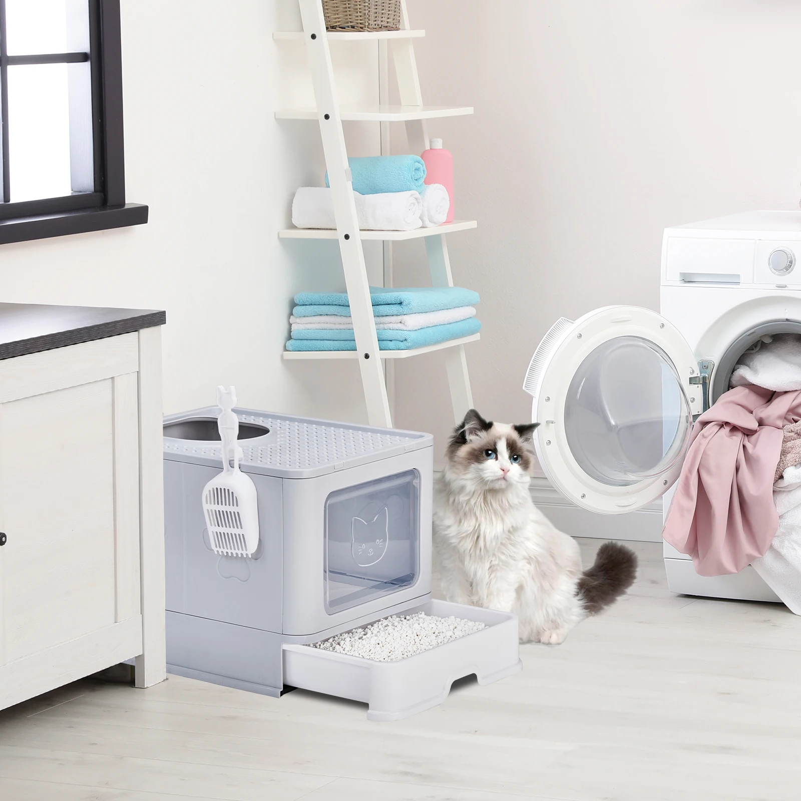 Large Enclosed Cat Litter Box with Lid Cover, Detachable Cat Toilet with Litter Scoop Slide Out Tray Front Entry Top Exit Door