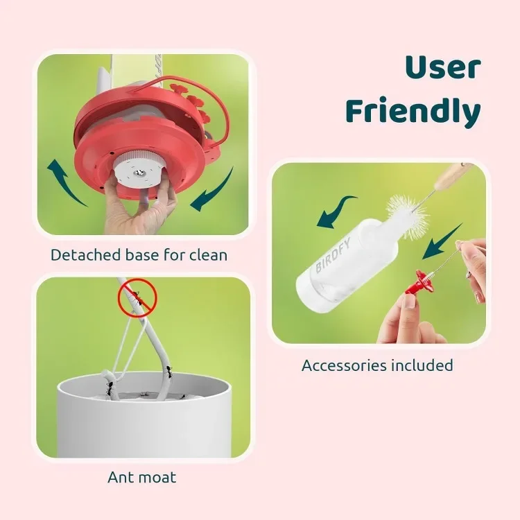 ăAnt Moat & Clean Easily & Eco-Responsibleă To keep ants away from the hummingbird feeder, we adopt a patent design to add water from the top to keep ants at bay. A 20 oz transparent reservoir can keep nectar fresh and avoid frequent refills. Effortlessly clean the entire setup with a detachable rotating base and a brush set. Without BPA anti-UV and corrosion-moat material, it is safe for hummingbirds and durable for outdoors.