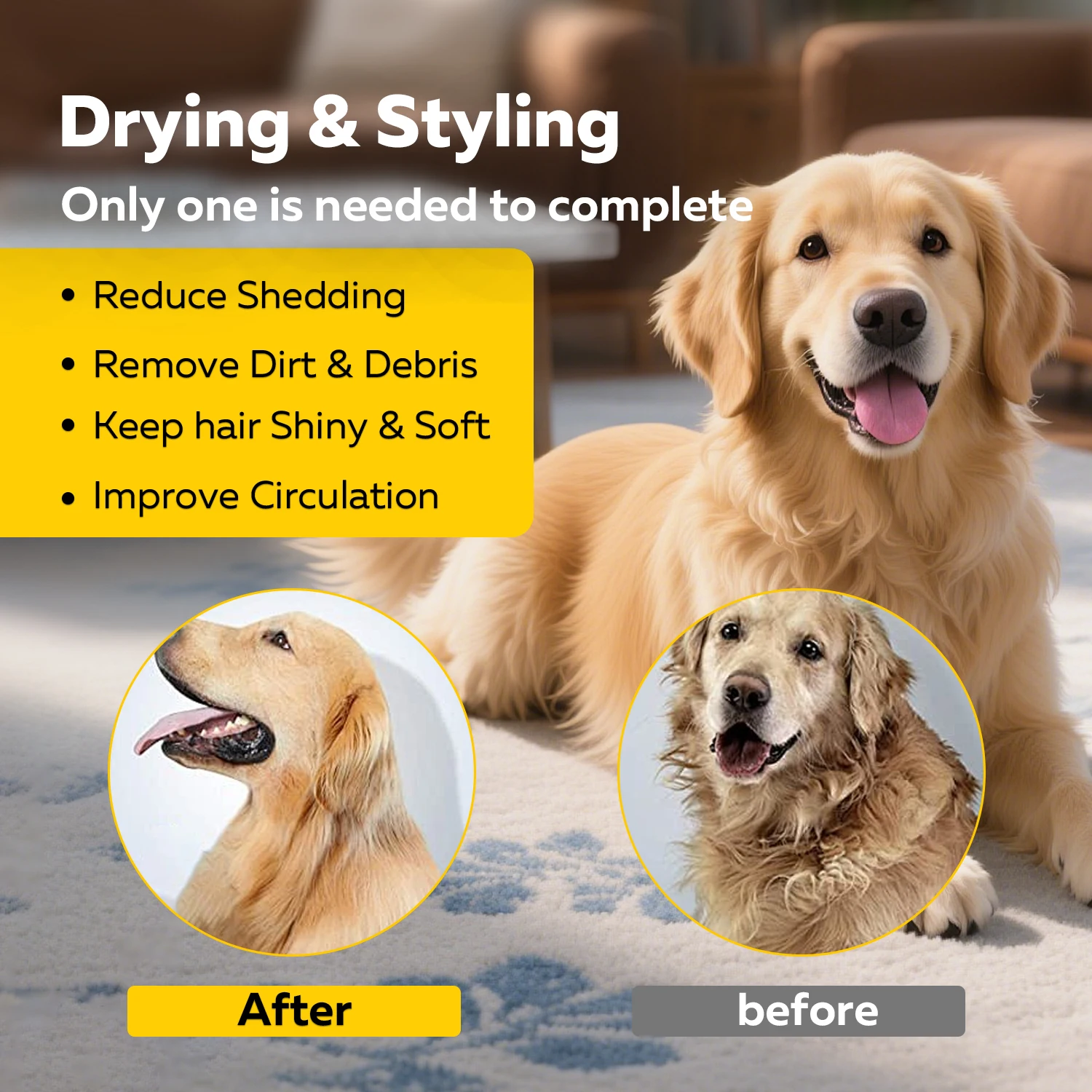 ✅ 70% Faster Drying 3HP Pet Hair Dryer62m/s high-velocity airflow dries wet pets (Corgi/Golden Retriever) in 15 mins (vs 65 mins with regular dryers), cutting grooming time drastically for more playtime with your furry friend.