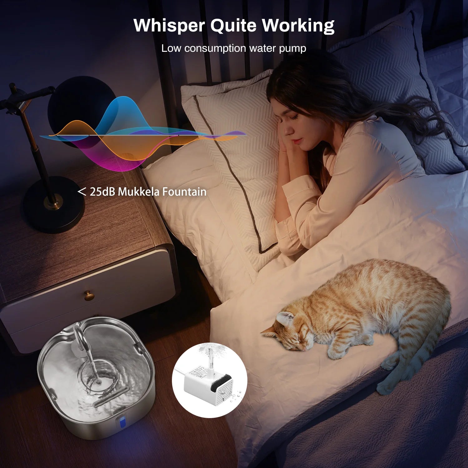 Whisper-Quiet Cat Water Fountain: <25dB low-noise pump operates silently, creating a peaceful environment without disturbing cats' rest or household activities.